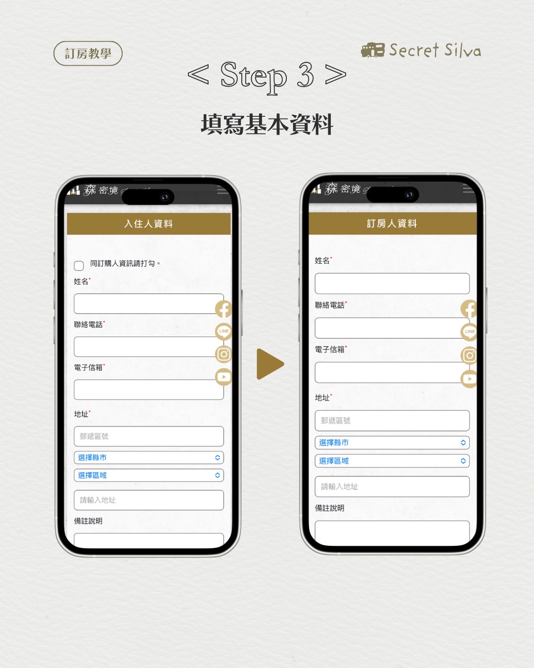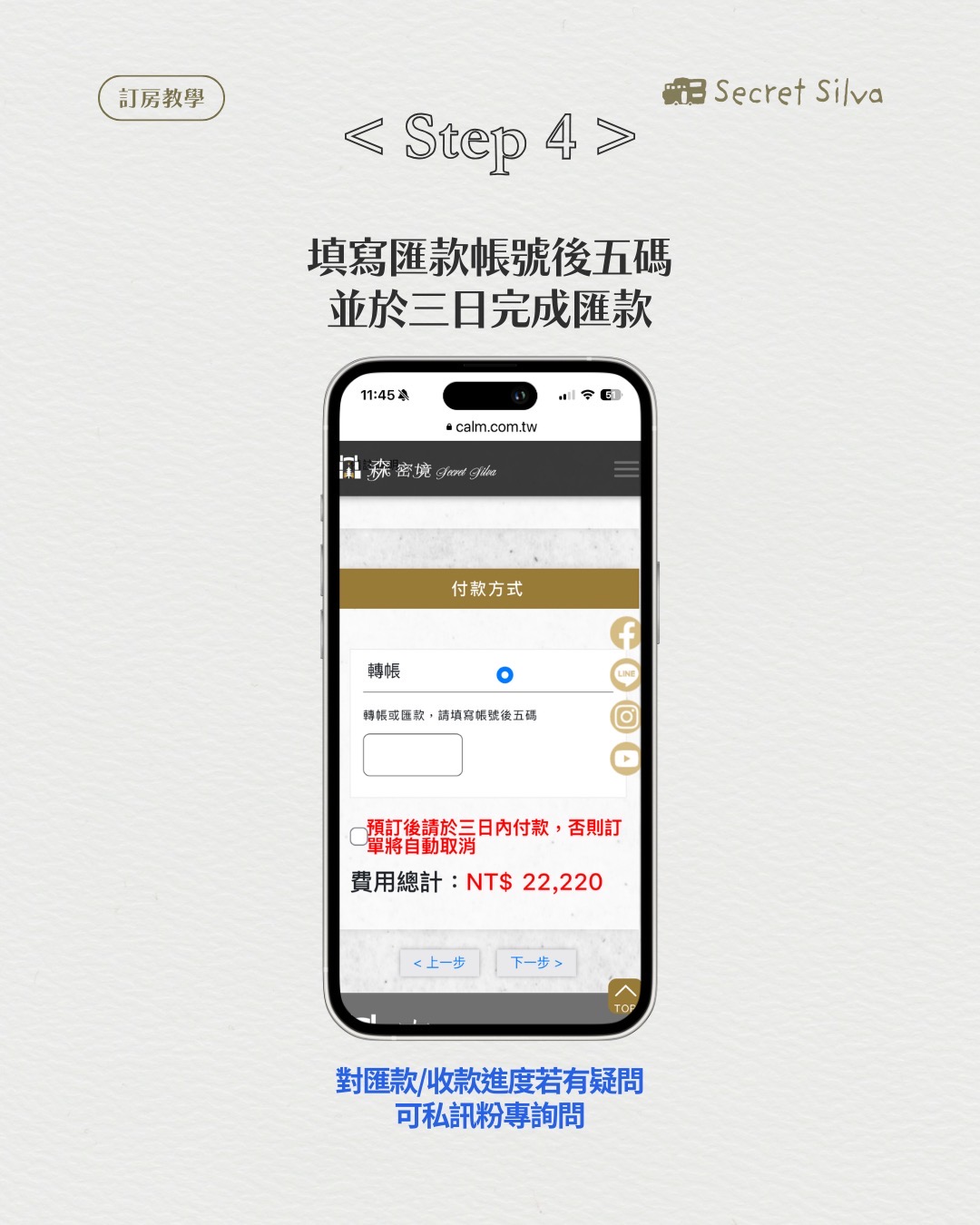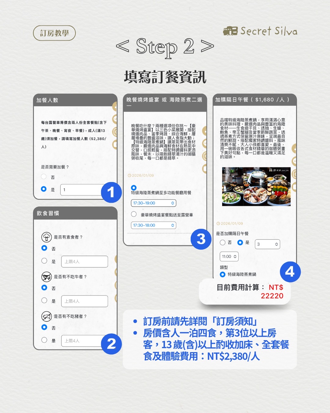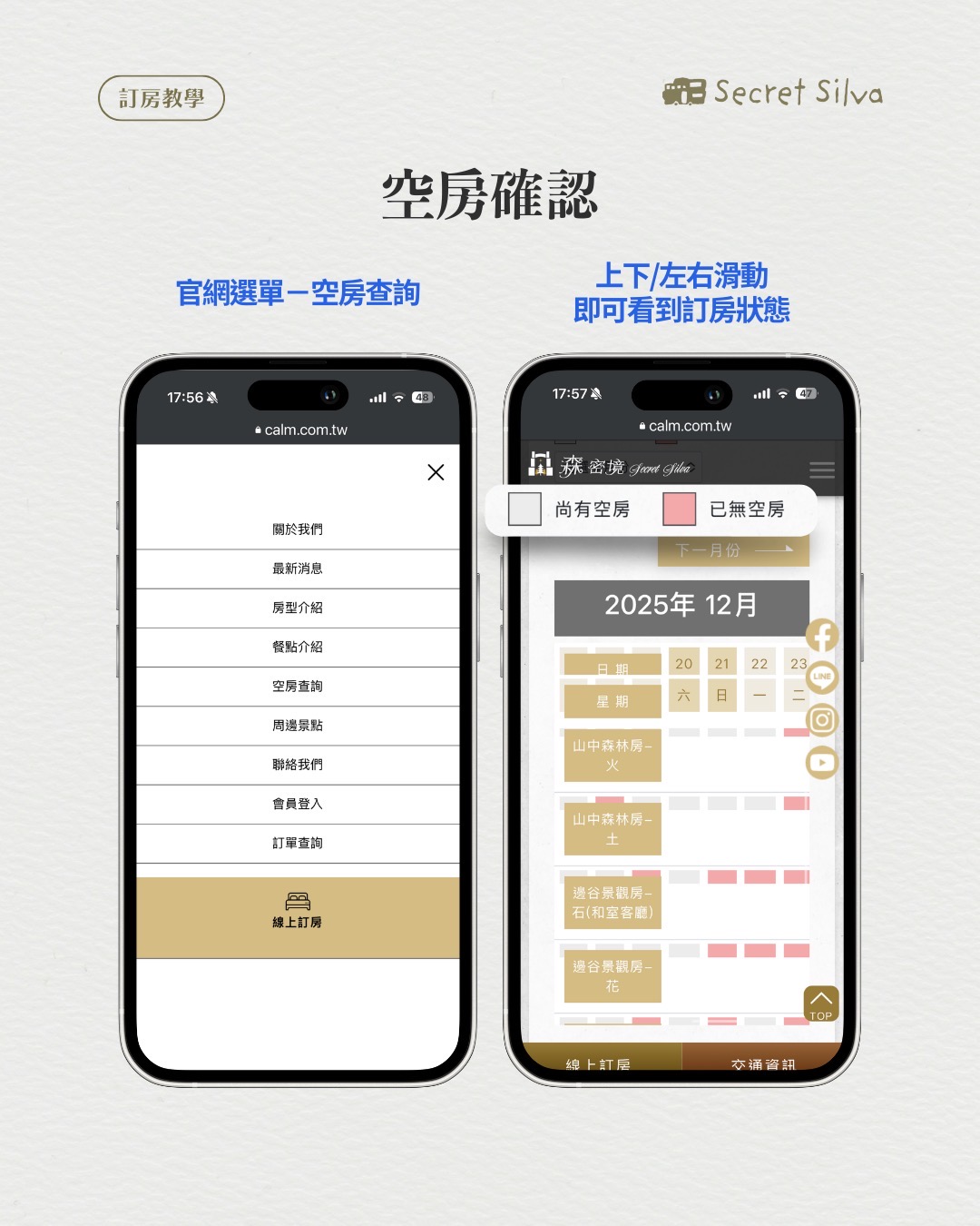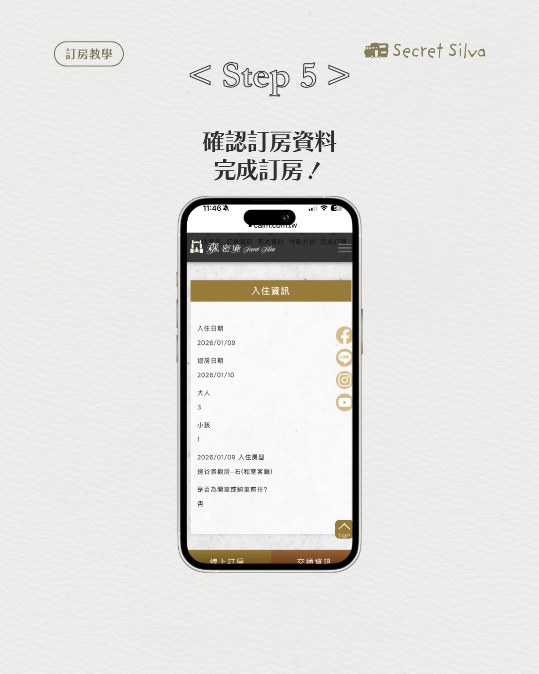 FAQ 2026-02-18 官網訂房教學 / 空房查詢 ① 選擇日期/人數/房型 ② 填寫訂餐/過敏資訊 ③ 填寫個人基本資料 ④ 三日內匯款後填寫帳號後五碼 ⑤ 確認預定資料,完成預約! 空房確認 回上一頁